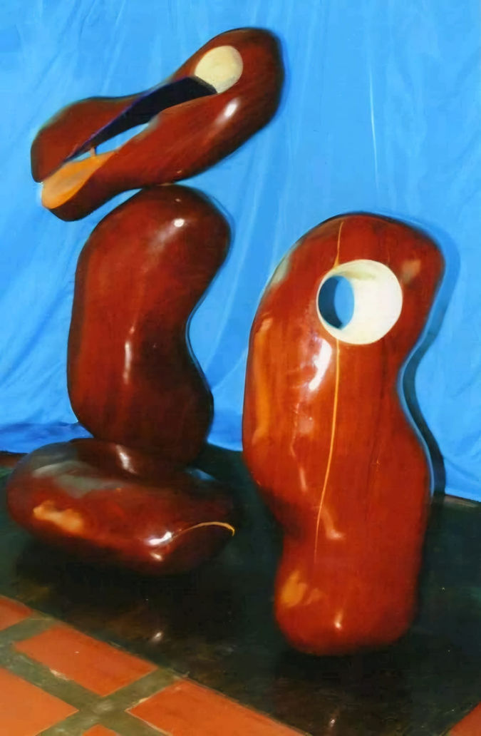 Figuras tridimensionales ensambladas, yuxtapuestas, adheridas o vinculadas, por un filamento o conexión visible (alambre, acero, tubería fina, conductos) que conecta secuencialmente los segmentos, interespacios, fases o núcleos conformativos de la pieza o estructura escultórica o Secciones de Levitación Objetual, en mi criterio; logrando exaltar la impresionante majestuosidad y magnetismo de sus convexidades, concavidades, ovalaciones, circularidades, amorfidades, orificios o perforaciones y asimetrías constructivas.